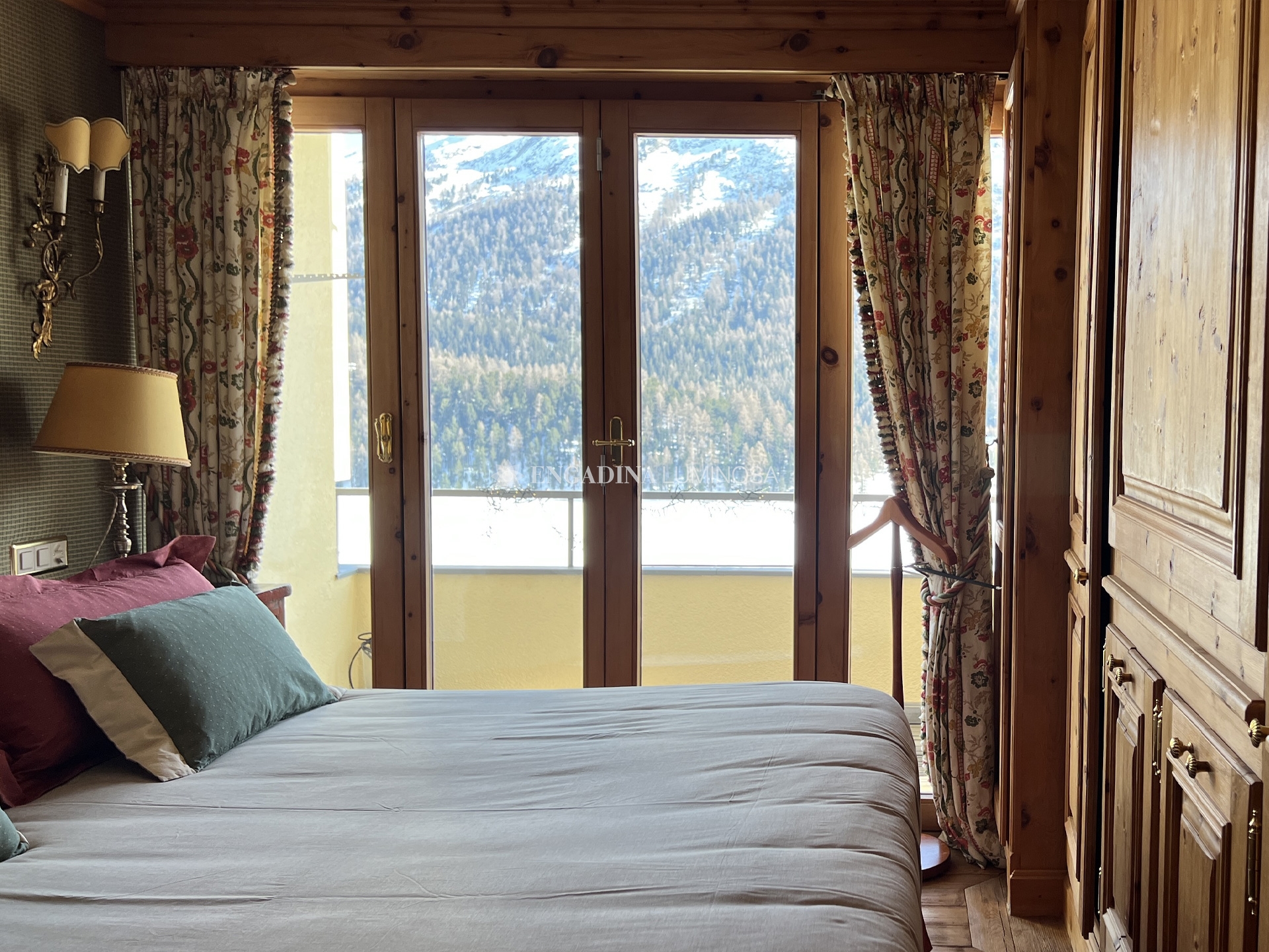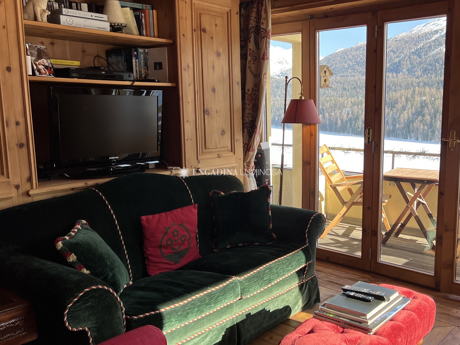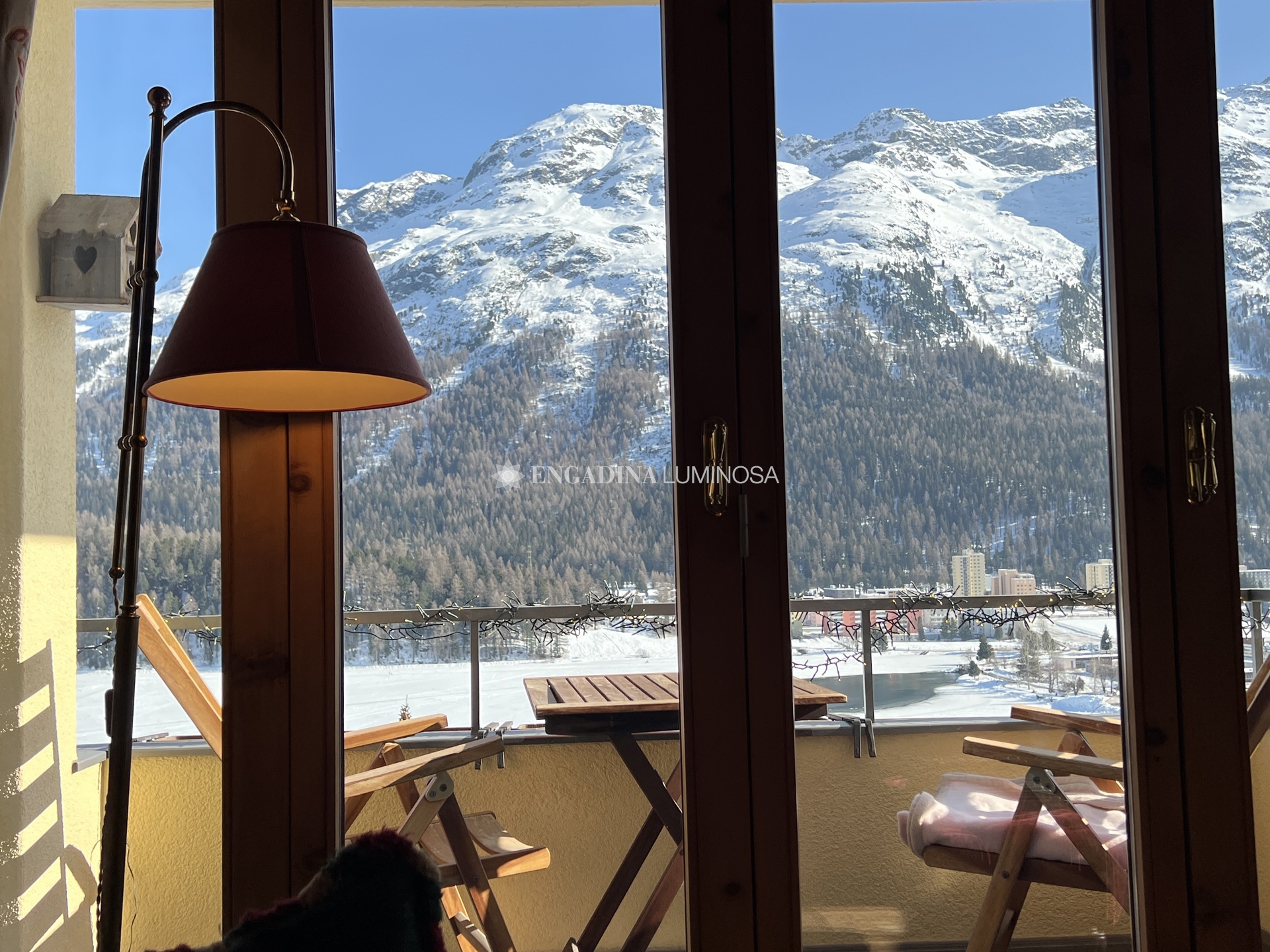 Dall’ingresso si accede a un soggiorno raccolto e luminoso, con zona pranzo e balcone panoramico che domina il lago di Saint Moritz e le montagne circostanti: una vista davvero incomparabile.