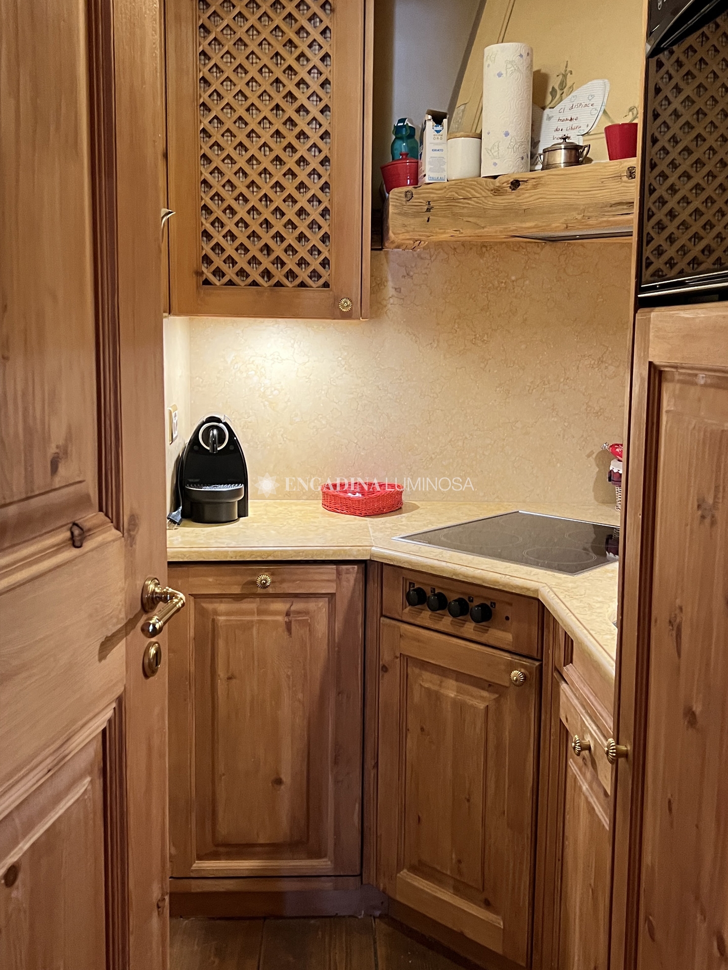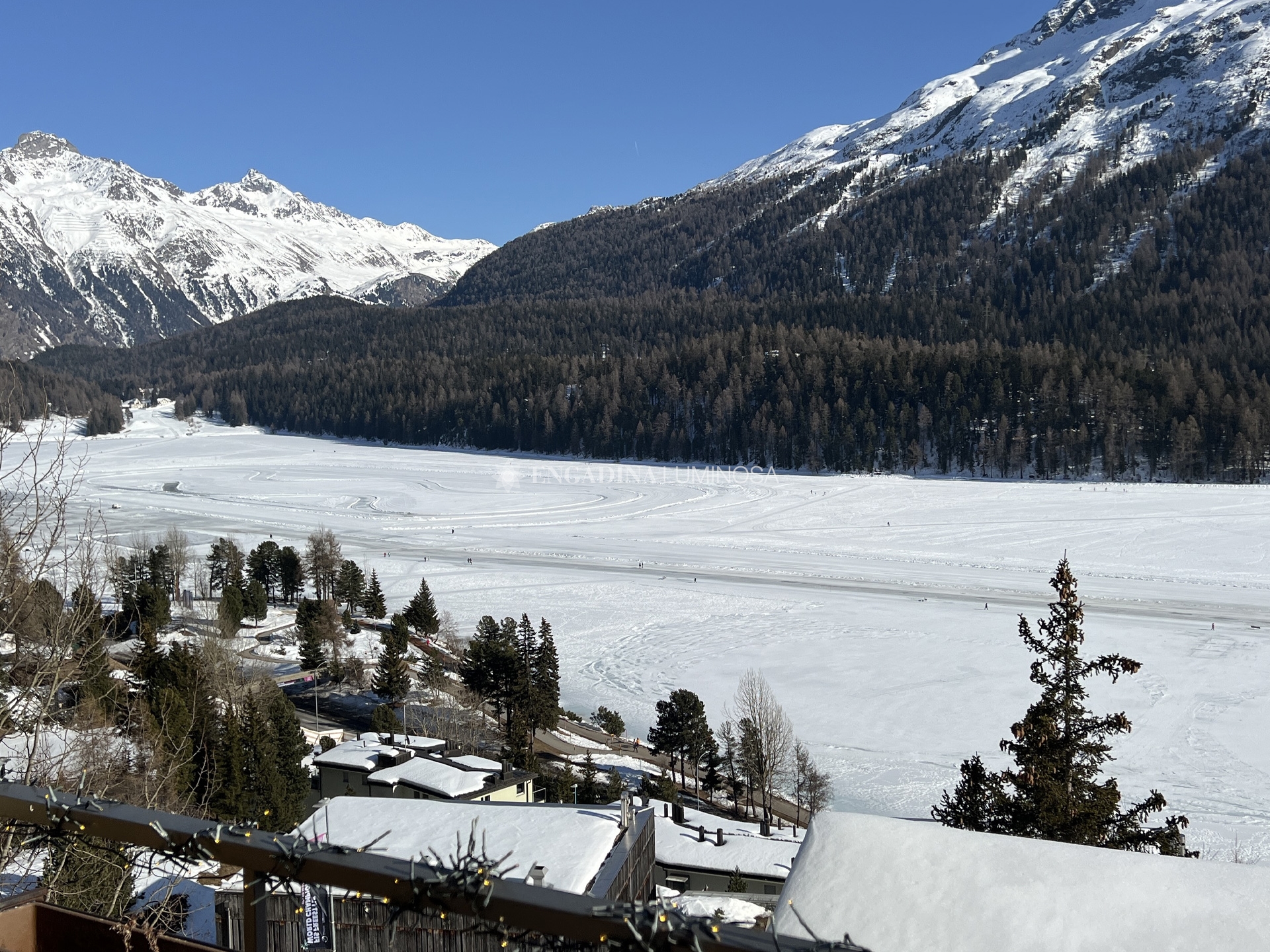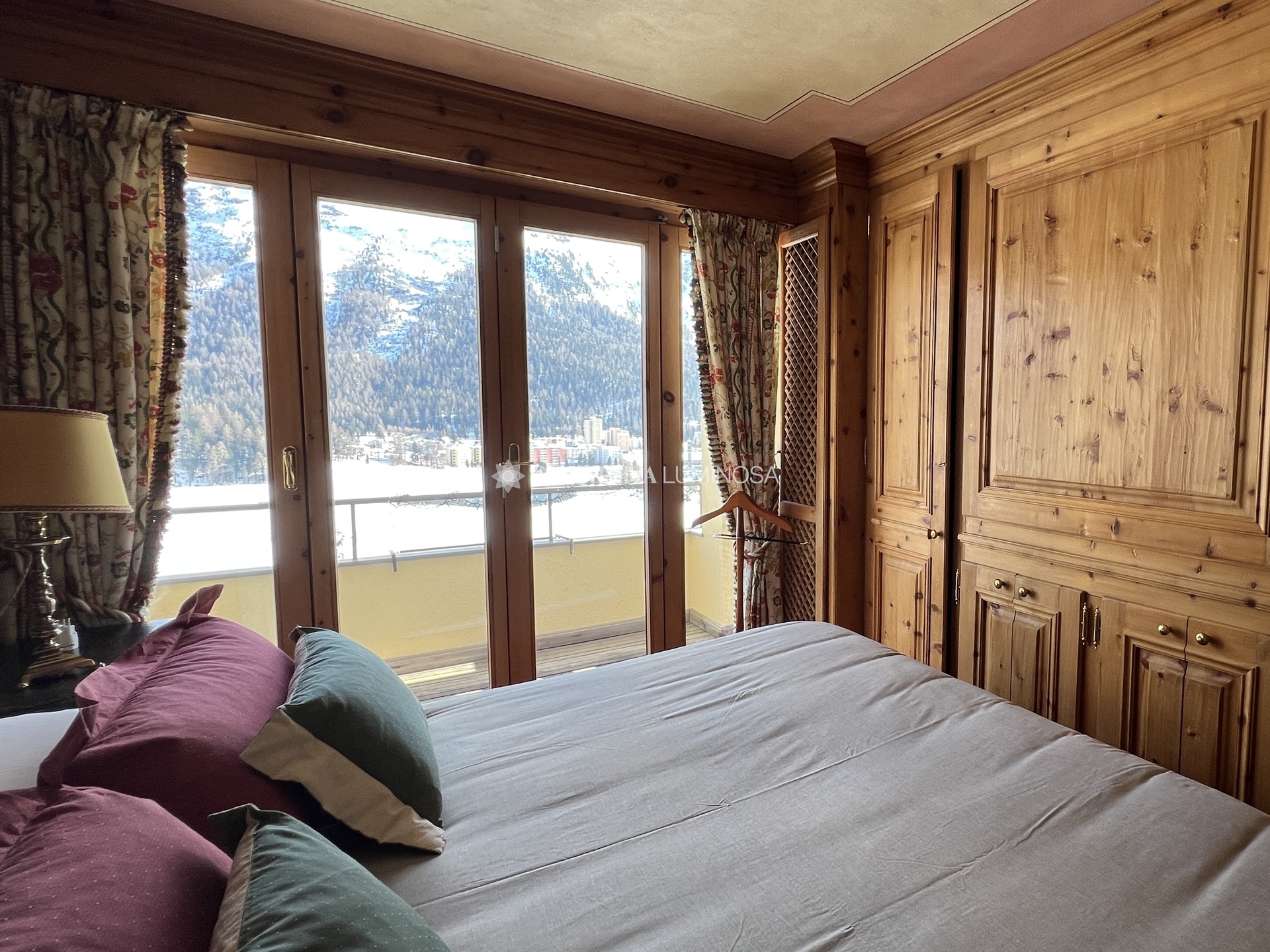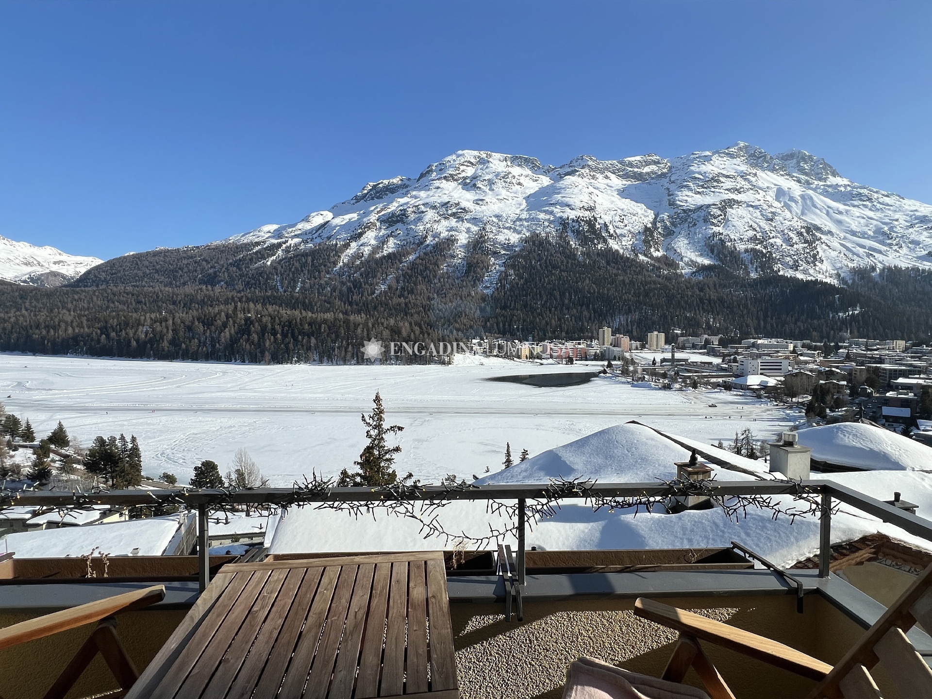 Dall’ingresso si accede a un soggiorno raccolto e luminoso, con zona pranzo e balcone panoramico che domina il lago di Saint Moritz e le montagne circostanti: una vista davvero incomparabile.